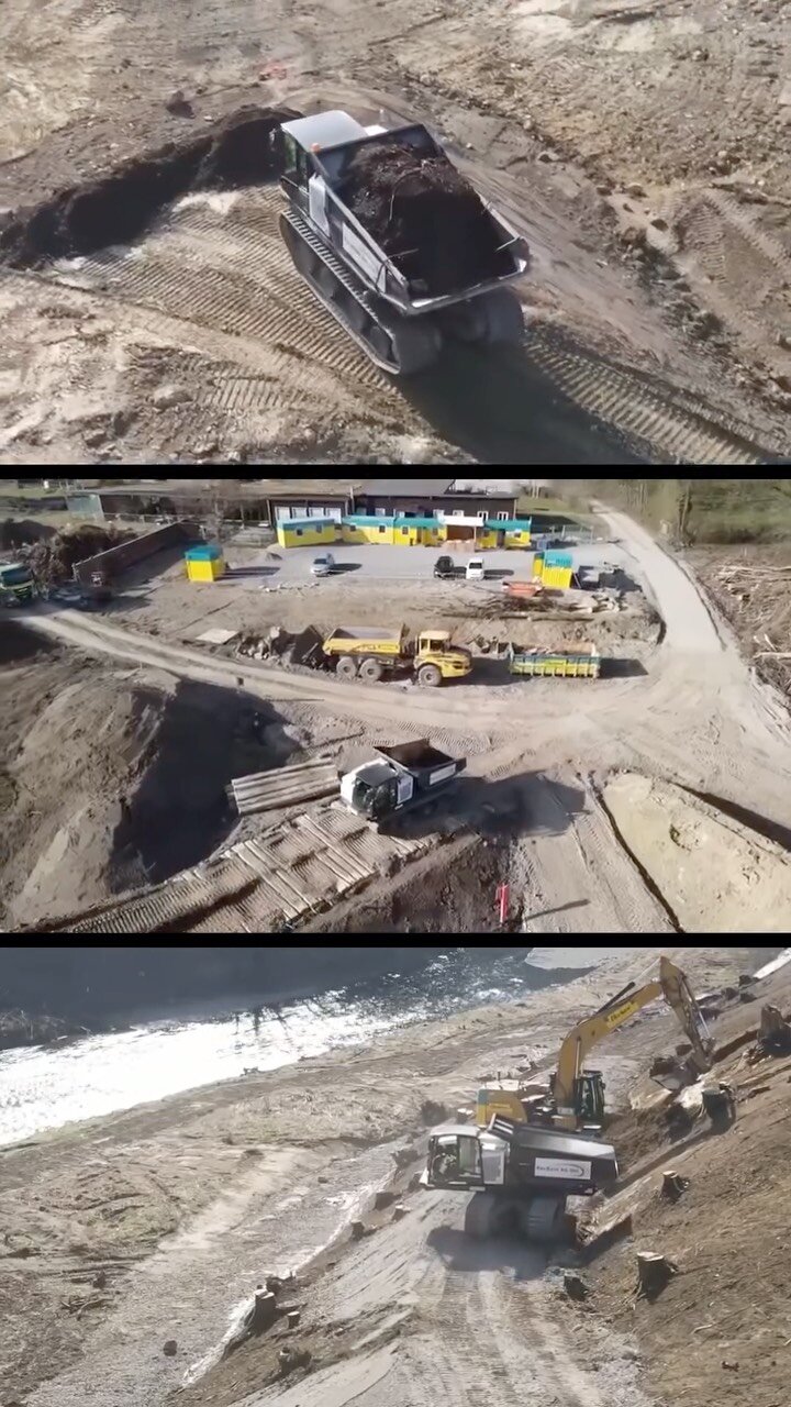 Aerial proof our rotating crawlers run the site 🏗️ If you need a way through soft ground, steep banks, and tight turns, the #PantherT14r is how you keep the operations rolling 🚧 Credits: @baurent_ag_ost 🎥 #Prinoth #prinothcrawlercarriers #construction #constructionsite
