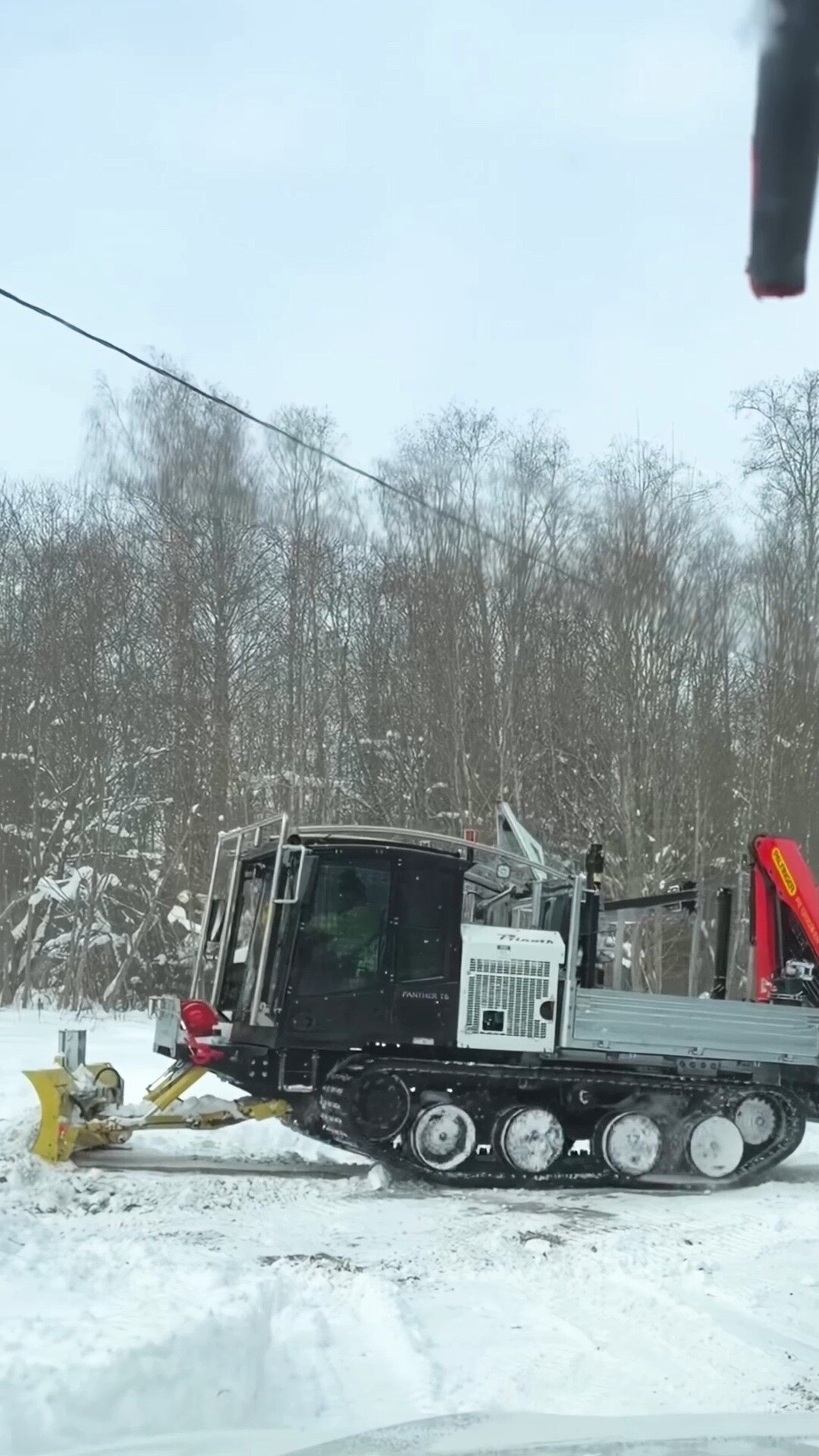 Snow covered roads❓ The job still gets done ❄️ The #PantherT6 pushes through winter terrain and gets you to the lines, so your crew can dismantle the old and install the new, even when access is limited ⚡ Dealer: @unimotors.lv 🤝 Credits: @sadalestikls 🎥 #Prinoth #prinothcrawlercarriers #linemaintenance #lineman